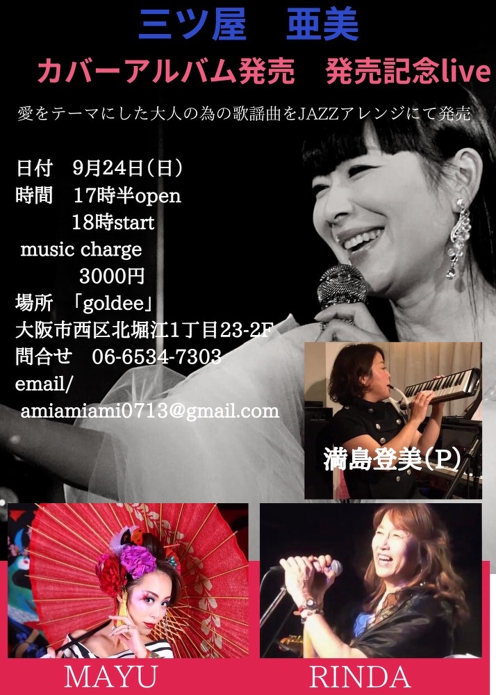 愛をテーマにした大人の為の歌謡曲をJAZZにて発売の三ツ屋亜美カバーアルバム発売記念liveを9月24日にライブハウス、堀江Goldeeで開催します。ぜひご参加下さい!