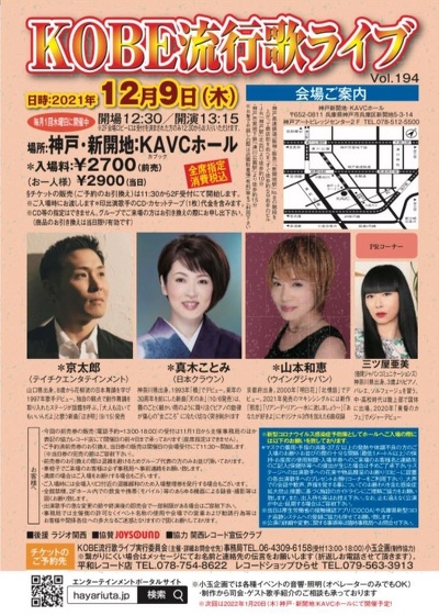 KOBE流行歌ライブ KOBE流行歌ライブ 12月9日(木) 場所:神戸・新開地:KAVACホール 開場:12:30 開演:13:30 【入場料】 前売2700円 当日2900円 流行歌 スケジュール表