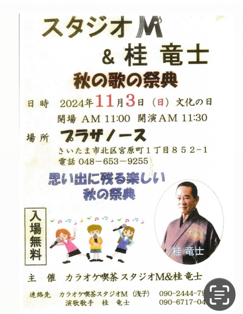 11月3日(日) スタジオM & 桂竜士 プラザノース 応援歌唱!! 11:00開場/11:30開演 入場無料