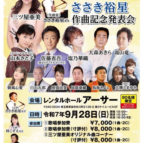 2025年9月28日 新曲披露&ささき裕星先生作曲記念発表会出演決定!レンタルホールアーサーで特別なステージ
