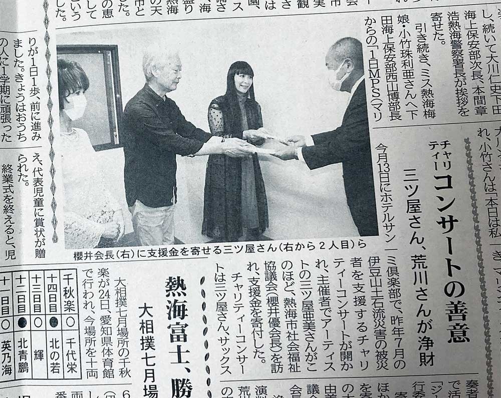 令和4年7月26日(火)付けの伊豆毎日新聞に「チャリティーコンサートの善意 三ツ屋さん、荒川さんが浄財」の見出しで記事が掲載された。